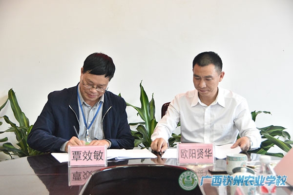 覃效敏副校长(左)与广西芳草安桂生物科技有限公司总经理欧阳贤签订校企合作协议