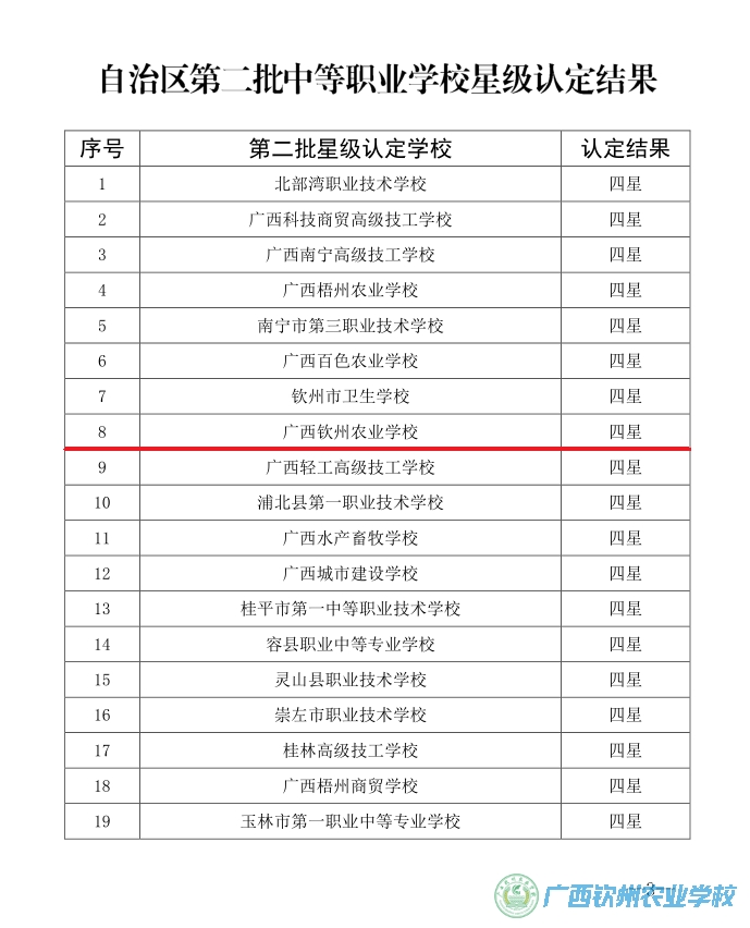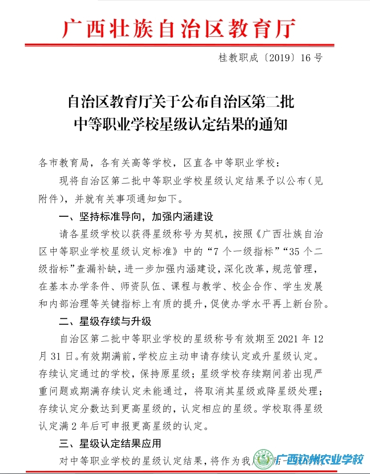 根据2019年4月25日颁发的《自治区教育厅关于公布自治区第二批中等职业学校星级认定结果的通知》(桂教职成﹝2019﹞16号)精神,我校被认定为广西四星级中等职业学校。
