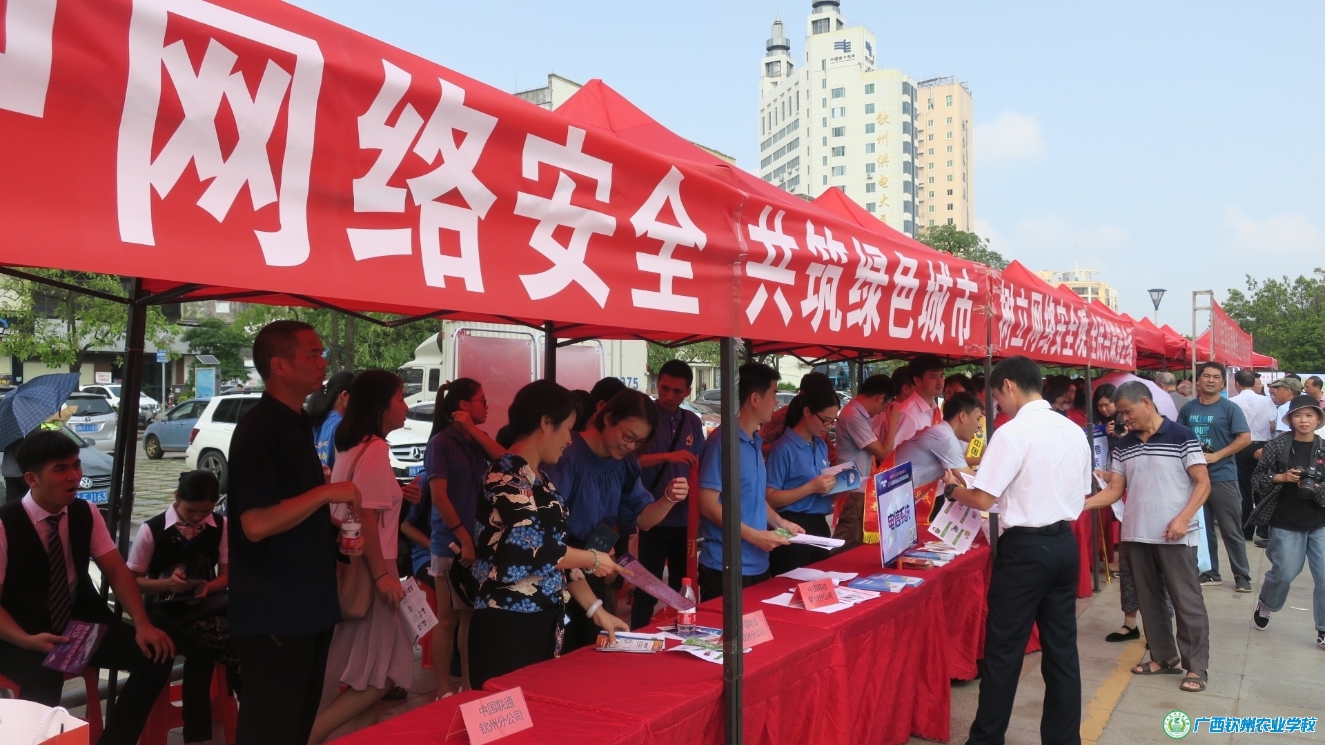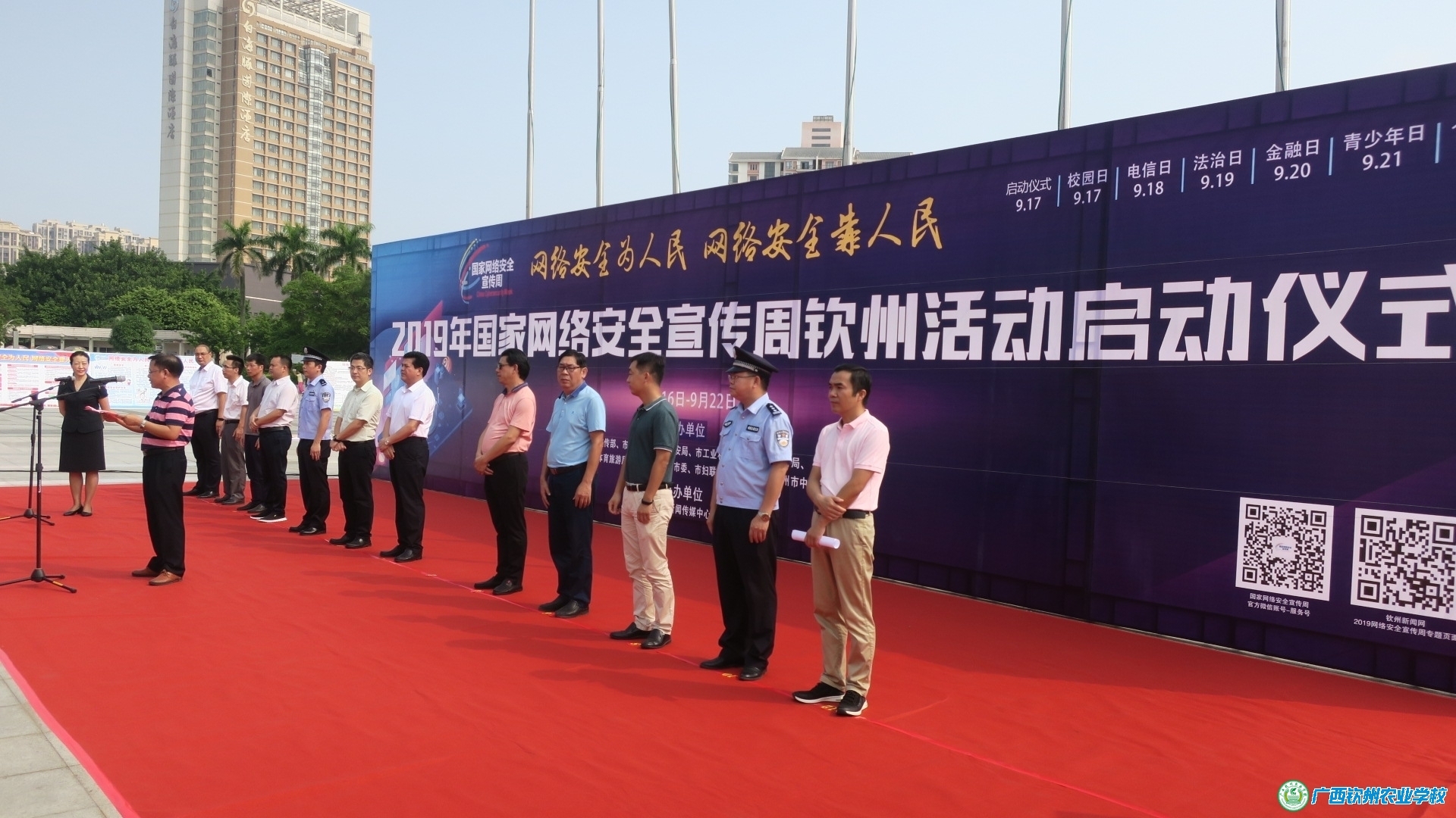 2019年9月17日上午,钦州市2019年国家网络安全宣传周启动仪式在钦州湾广场举行,我校派出信息中心老师覃垚参加本次活动。本届国家网络安全宣传周活动主题为“网络安全为人民,网络安全靠人民”。此次活动由钦州市宣传部、钦州市委网信办主办。仪式上市委宣传部副部长、市委网信办主任阮成武做部署讲话,华为公司、电信系统代表、北部湾大学生代表分别进行发言。