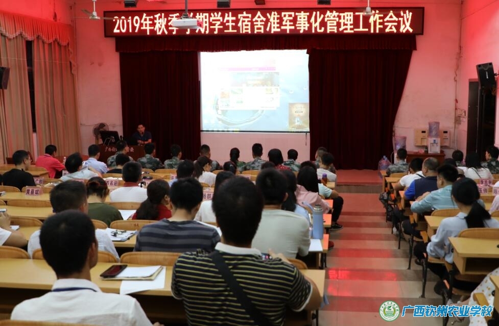 为进一步深入推进和全面落实我校学生宿舍准军事化管理工作, 10月13日晚上,我校在电化教室召开2019年秋季学期学生宿舍准军事化管理工作会议,会后各班开展主题班会活动。陈明强副校长出席会议并讲话。学生科老师、全体教官和班主任参加会议。会议由学生科邓业斌科长主持。