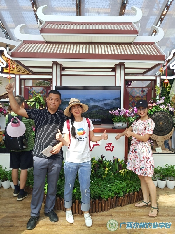 图一 三位老师在世园会中国馆广西室内展区前合影