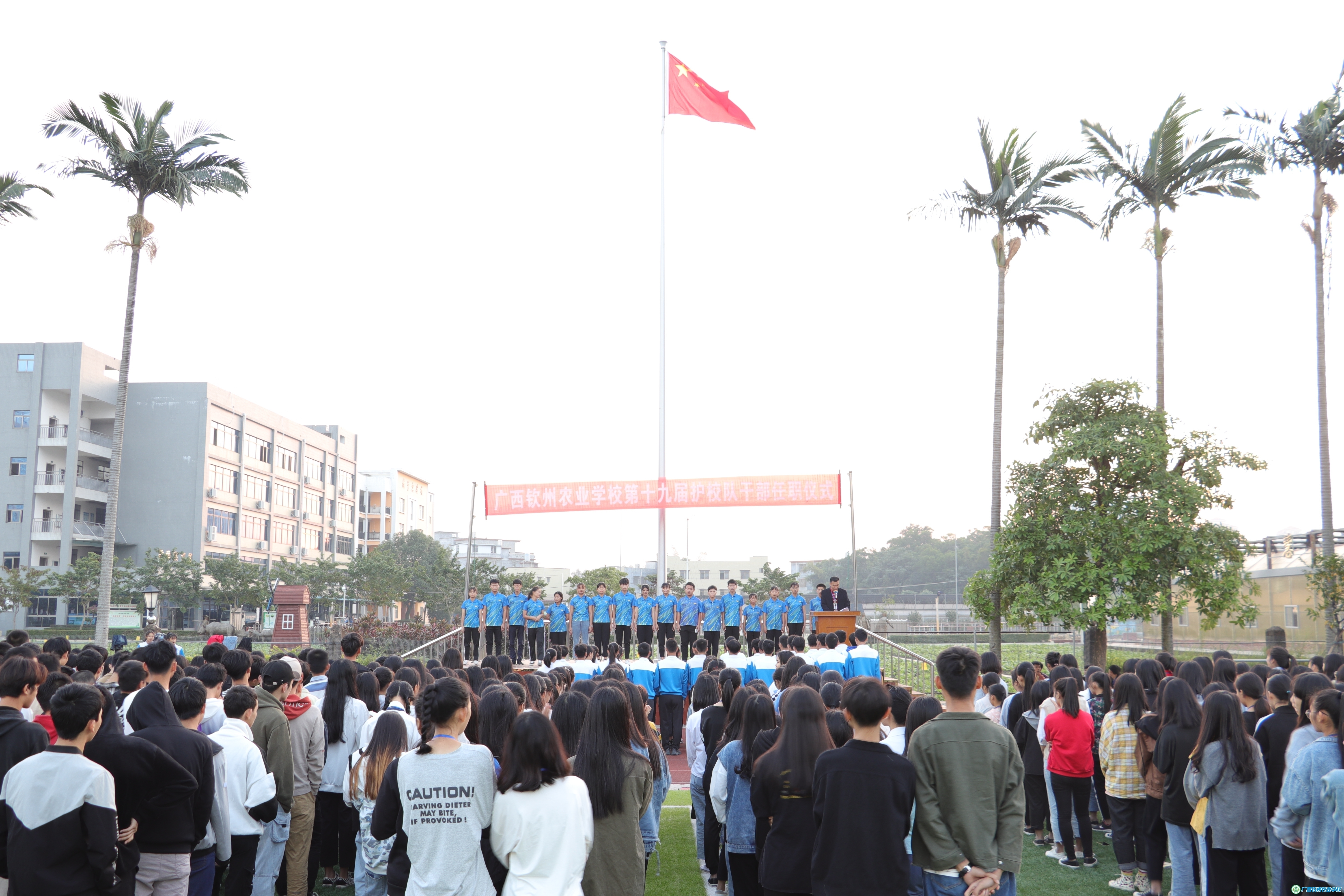 2019年11月8日早操时间,保卫科在学校大操场举行了第十九届护校队干部任职仪式,参加仪式的有陈明强副校长、保卫科的全体老师、班主任和全体同学。保卫科吴明科长主持任职仪式。