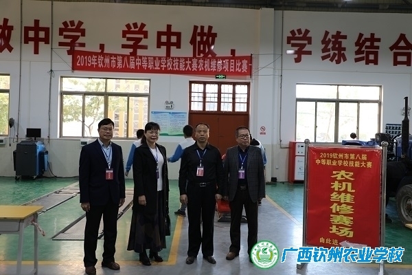 钦州市教育局罗玲监督员(右二)、钦州市职业教育中心工会主席米东荣(左一)、我校的伍国樑校长(左二)和覃效敏副校长(右一)巡视农机维修项目比赛现场