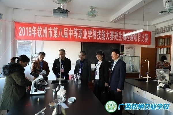 钦州市教育局罗玲监督员(左二)、钦州市职业教育中心工会主席米东荣(左三)、我校的伍国樑校长(右三)和覃效敏副校长(左一)巡视微生物检验项目比赛现场