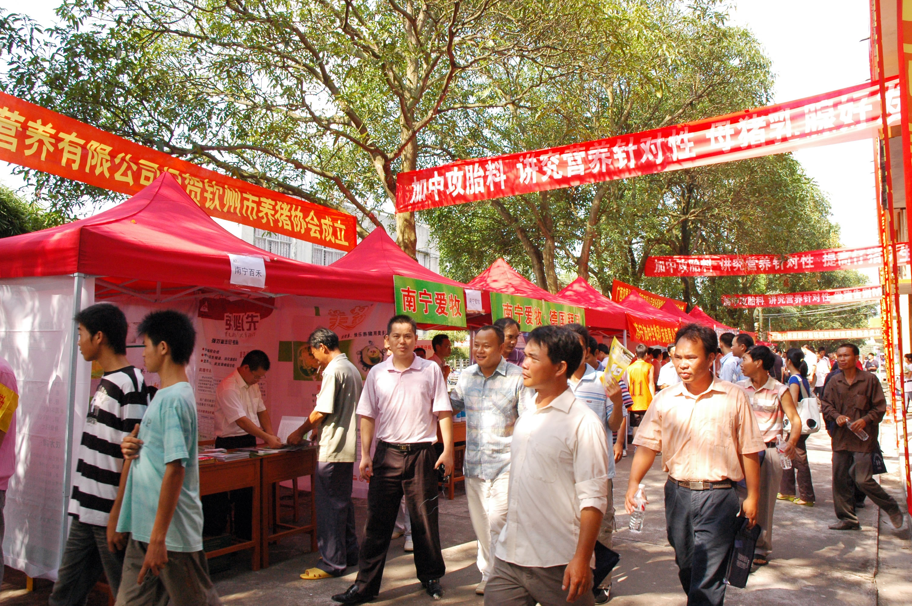 是日上午,秋高气爽,阳光灿烂。校园内人头攒动,车流不断,大礼堂周围到处是红彤彤的挂幅,临时搭成的一个个企业宣传摊点,整齐有序地列布在学校大礼堂东南边的校道旁,一派喜庆热闹的场面!这些“摊点”就是30多家与养猪、养禽业密切相关的企业已早早在此抢占商机,等候“老板”们光临,洽谈生意。