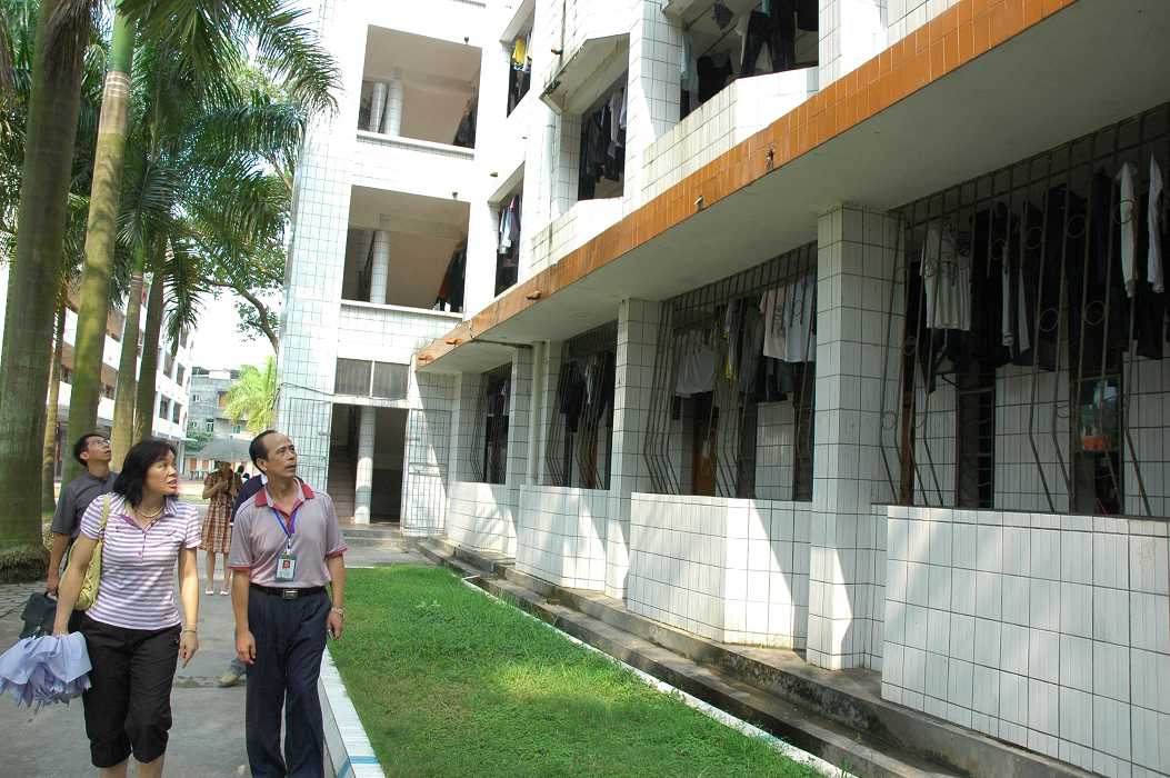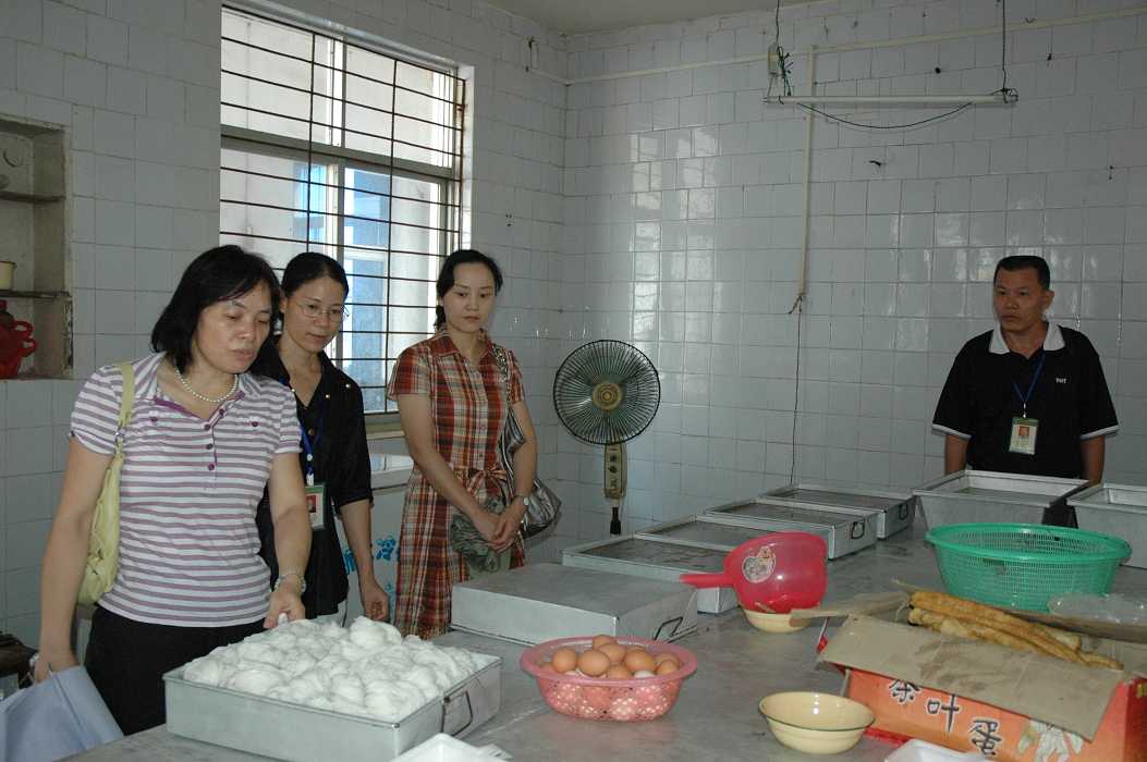 高崇敏副处长(左一)在覃一静副校长(左二)陪同下检查学校食堂