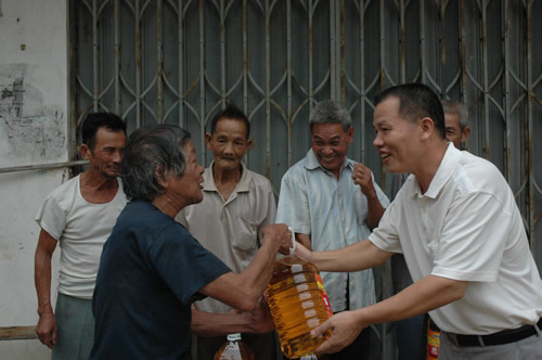 工会陆武昌主席(右)向五保户送上慰问品