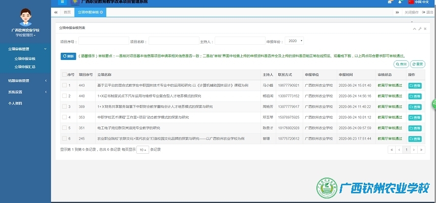 根据自治区教育厅《自治区教育厅关于组织申报2020年度广西职业教育教学改革研究项目的通知》(桂教职成〔2020〕14号)文件精神,我校自治区教育厅教育教学改革项目经过一个多月的斟酌选题、资料查询论证、申报书的反复修改、学校费心的初审选择,《基于云平台的混合式教学在中职园林技术专业的运用和研究-以计算机辅助园林设计为例》、《电工电子岗位群及其适岗专业教学的研究》、《农业职业院校“农耕文化 现代农业”打造校园文化品牌的探索与研究—以广西钦州农业学校为例》、《中职学校艺术课程“工作室+项目”动态教学模式的探索与研究》、《1+X财务共享服务背景下中职财会教学重构会计人才培养模式的探索与研究》、《1+X证书制度试点下汽车运用与维修专业复合型人才培养模式的探究》等6项项目从14项项目中脱颖而出,被推荐参加教育厅申报评审,进行了系统填报提交,并于6月29日通过了自治区教育厅材料初审。