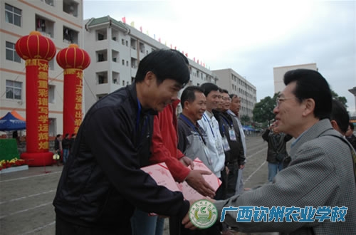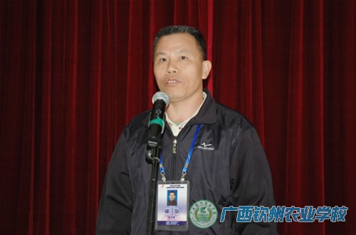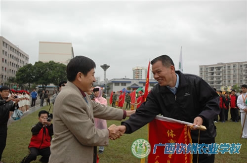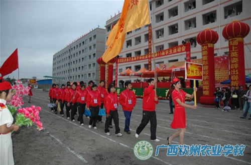 2009年11月18日下午,钦州农校鼓乐喧天,人头攒动,热闹非凡。学校领导、各相关部门负责人、学生会、团委会全体干部、青年志愿者和护校队全体成员,以及500多名师生,在中心校道列队欢迎参加区农业厅属中等职业学校第十一届学生运动会的我校代表团载誉归来,学校领导为代表团成员献上了鲜花。在一片掌声和欢呼声中,学校领导和代表团一起,走进电化教室,学校为代表团举行一个简单而隆重的欢迎仪式。在欢迎仪式上,伍国樑副校长致欢迎词,代表团领队陆武昌主席和总教练裴朝发老师分别作了参赛情况汇报。