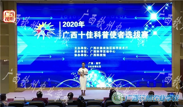 2020年8月13日、14日,自治区科技厅“2020年广西十佳科普使者选拔赛决赛”在广西科技馆报告厅举行,我校派出黄才娟、卢伟胜两位老师参加角逐。我校两位老师与众多专业选手同台竞技,大胆发挥,不怯场。其中黄才娟老师顺利进入决赛,决赛中经过自主命题讲解、随机命题讲解、科技常识问答、评委问答等环节的优秀表现,荣获三等奖。这是继2019年我校李彬彬老师荣获“十佳科普使者”荣誉称号、曾珊老师荣获这一赛项三等奖之后,我校再获这一赛事奖项。我校已经连续两年在自治区这一赛事中斩获奖项,向社会展示了我校作为全国科普教育基地、全国青少年农业科普示范基地、自治区科普教育基地的不俗实力。