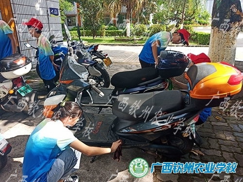 青年志愿者们认真为教职工清洗摩托车、电动车
