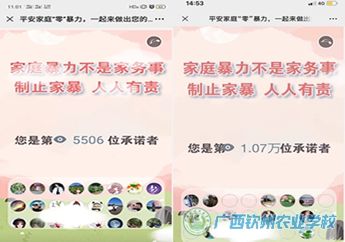 为维护妇女、儿童等弱势群体的合法权益,有效预防和制止家庭暴力,创建平等、和睦、文明的家庭关系,在“11·25国际反家暴日”之际,我校妇委会响应上级号召,组织女职工开展线上学习活动并参加“广西百万家庭反家暴网络签名承诺活动” 、“学习强国”APP“专项答题”栏目“中华人民共和国反家庭暴力法”专项答题。女职工们积极参与答题和网上签名承诺,以实际行动共同预防和制止家庭暴力,构建和谐家庭关系。