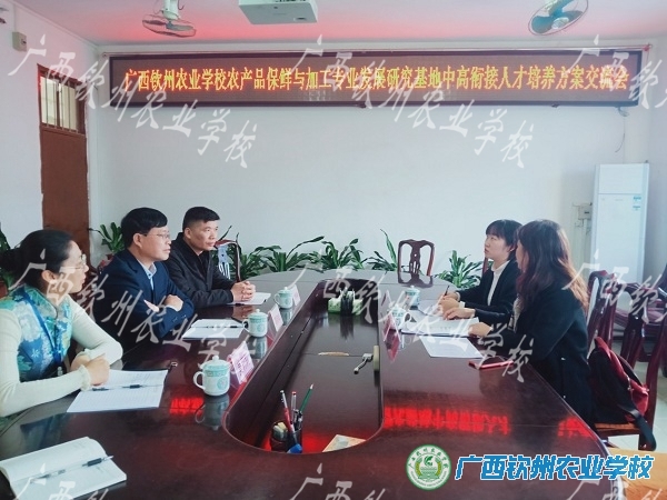 2020年12月11日上午,广西农业职业技术学院食品工程系食品加工教研组负责人魏萍、黄友琴副教授到我校开展交流活动。我校农产品保鲜与加工专业群教育发展研究基地项目组覃效敏副校长和主持人马军主任、教务科叶颜春副科长、现代农业教学部莫莉莉主任和20级食品加工高职班班主任马小峰老师出席交流会。