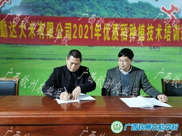 活动中,校企双方参观大米加工车间、第一期灵山县高素质农民培训班宣传展版,近年来,石塘镇勤达大米有限公司采取“公司+基地+农户”的模式,致力于优质米的生产,公司拥有自己种植的优质稻种植基地100多亩,并与上流、廖村、深水、红星、塘美、苏村等村500多户农户签订6000多亩优质稻种植合同,每年大米产能达到1.2万吨。2020年12月,该公司选送的优质香米畾优1068荣获2020年广西“好种好品”擂台赛“好吃大米”金奖。对于公司取得的成绩,校方给予了高度肯定和赞叹,认为“勤达大米公司不愧是本地区农业发展新星,是值得深入合作的好企业。”公司领导和当地农业农村局领导也是对第一期灵山县高素质农民培训班中我校有效的组织和高水平的授课给予高度的赞誉。双方就校企合作问题进行了深入探讨,在人才共育、实训基地、农民培训、课程共建等方面,达成了合作共识,签订合作协议书。