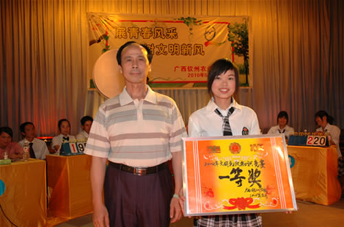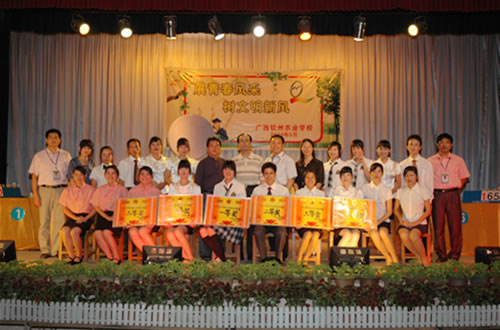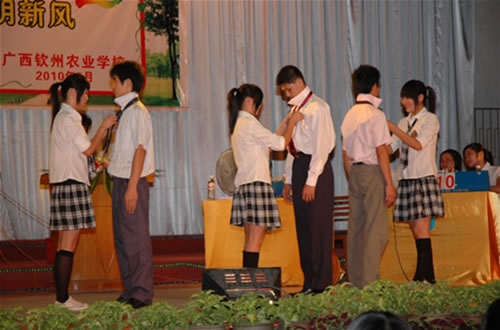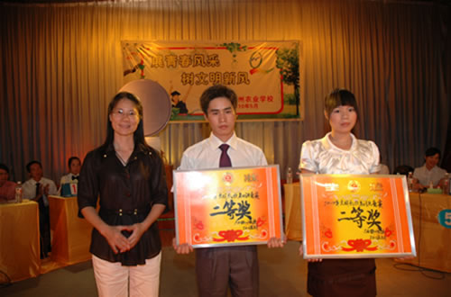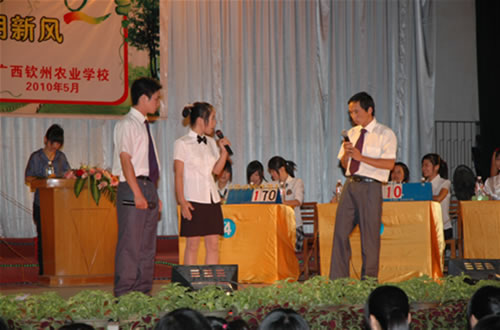 “文明礼仪知识竞赛”的比赛现场刘波校长为荣获“文明礼仪知识竞赛”一等奖的代表队颁奖伍国樑副校长作了总结讲话并为获奖的代表队颁奖覃一静副校长为获得二等奖的代表队颁奖李红调研员为获奖得一等奖的选手颁奖比赛现场技能表演现场答题参赛选手与领导合影留念