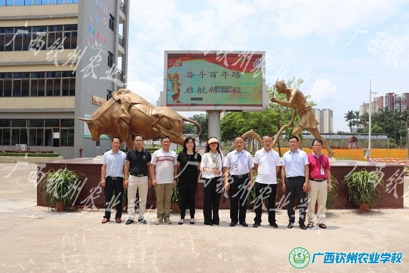 考察团与学校领导在铸铜耕牛雕塑合影