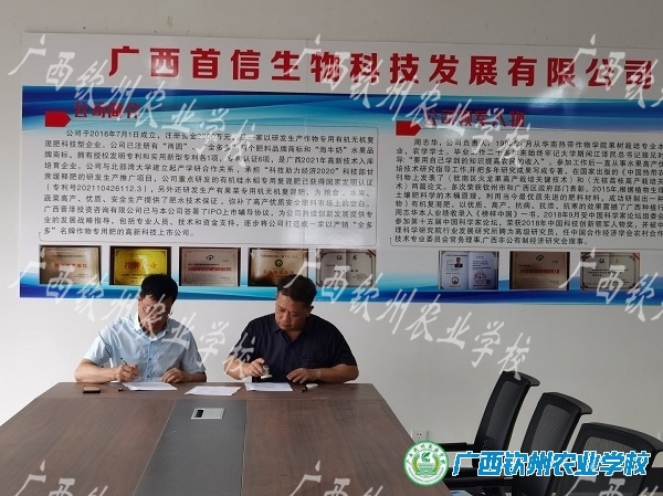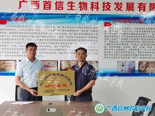 5月18日,广西钦州农业学校与广西首信生物科技有限公司产学研校企合作暨校企共建实训基地授牌仪式在广西首信生物科技有限公司举行。广西钦州农业学校副校长覃效敏、教务科科长叶颜春、现代农业教学部主任莫莉莉以及广西首信生物科技有限公司负责人周志华等出席仪式,共同拉开校企合作序幕。