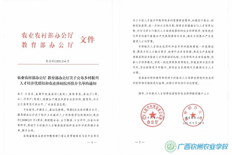5月26日,农业农村部科技教育司、教育部职业教育与成人教育司联合召开推介会,正式发布乡村振兴人才培养优质校和农业科研院所推介名单。 全国共有101个单位入选(广西4个),广西钦州农业学校榜上有名。