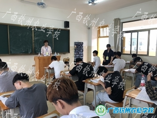 图一为农业职业技术学院继续教育部主任覃一静(前排右一)和戴霏(前排中)在理论考场巡视督导