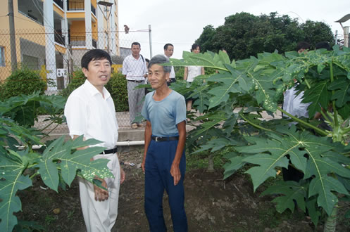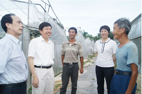 白总农艺师在学校领导的陪同下,深入到我校教学田、现代农业示范园了解作物生长和优良品种的种植情况。在现代农业示范园,白先进总农艺师与我校农场技术人员进行亲切交谈,详细了解作物的田间管理,尤其是作物在汛期的管理,指出当前最重要的是要认真抓好防汛工作,在确保师生生命财产安全的同时,要想方设法减少天气灾害对农作物的危害,以确保有个好的收成。白总农艺师走进温室大棚,察看作物生长情况,看着长势良好的甜瓜、苦瓜和“矮红一号”良种木瓜苗,白总农艺师十分高兴,他向我校农艺师、“矮红一号”良种木瓜选育者蔡恒徽老师详细询问了有关情况,白总对蔡老师长期以来辛勤耕耘,不断研究、选育优良瓜果品种的精神表示赞赏,并指出,农校要发挥好自身优势,争取推出更多的优良品种,为现代农业作出应有贡献。