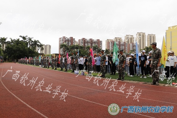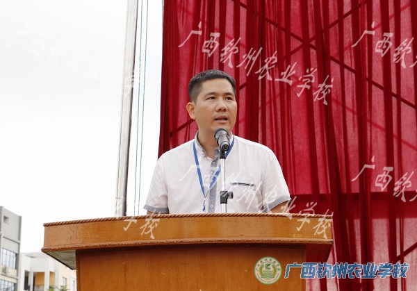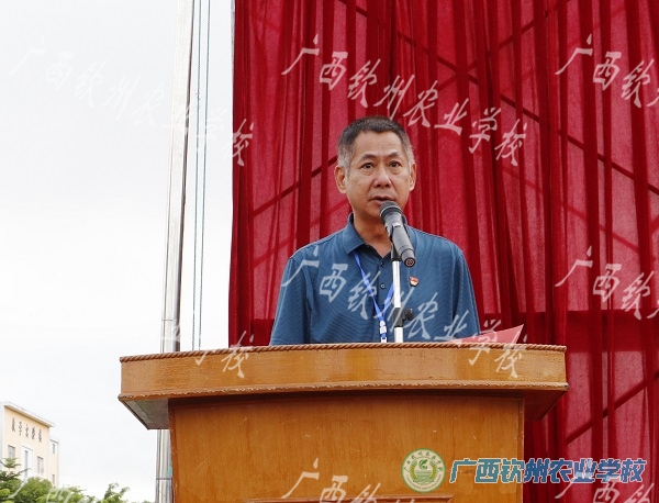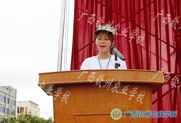 我校陈明强副校长讲话,他简单介绍了军训的意义,向参加训练的同学提出了希望:一是要尊敬教官,虚心向教官学习,听从教官和班主任安排;二是严格遵守军训纪律,服从命令,一切行动听指挥;三是严格要求自己,接受艰苦训练,锻炼意志,培养能力;四是要注重自我养成教育,充分展现钦农学子奋发向上的精神风貌。
