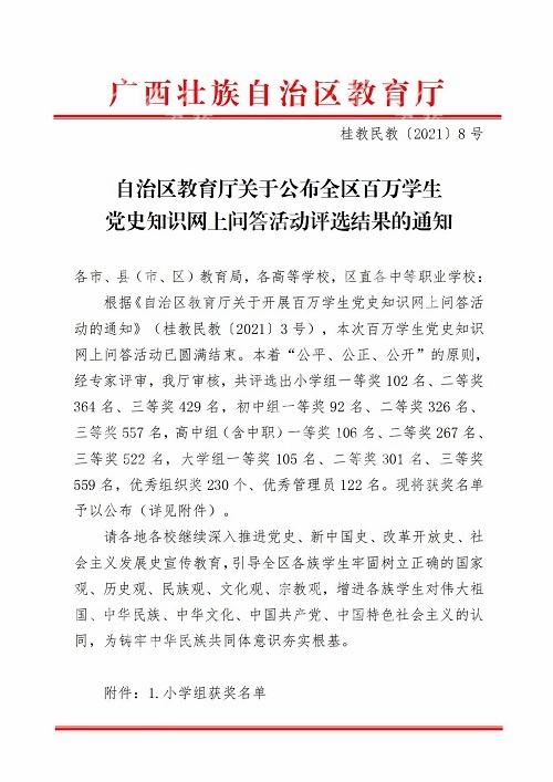 根据自治区教育厅《关于开展百万学生党史知识网上问答活动的通知》(桂教民教〔2021〕3号)精神,为了进一步提高夯实我校学生党史学习教育成果,我校结合实际,于6月10日至18日,组织全校学生(含高职班)参加了本次活动。