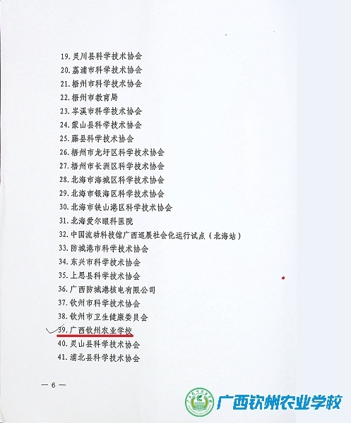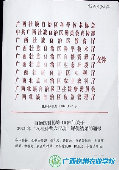 2021年12月27日,广西壮族自治区科学技术协会、中共广西壮族自治区委员会宣传部、广西壮族自治区教育厅、广西壮族自治区科学技术厅、广西壮族自治区自然资源厅、广西壮族自治区生态环境厅、广西壮族自治区水利厅、广西壮族自治区农业农村厅、广西壮族自治区卫生健康委员会、广西壮族自治区应急管理厅等10部门联发文《自治区科协等10部门关于2021年“八桂科普大行动”评优结果的通报》(桂科协普发〔2021〕46号),我校被评为自治区2021年“八桂科普大行动”优秀组织单位。我校组织和参与广西壮族自治区、钦州市“八桂科普大行动”多年,多次获自治区、钦州市“八桂科普大行动”先进、优秀组织单位。我们以职教人的社会责任心、职教人的职业技术回馈社会,科普能力得到自治区多部门及钦州市的肯定。科普是我校的特色之一,是我校办学能力展示的平台之一,我们将持之以恒,发展特色,展示能力,加快发展。