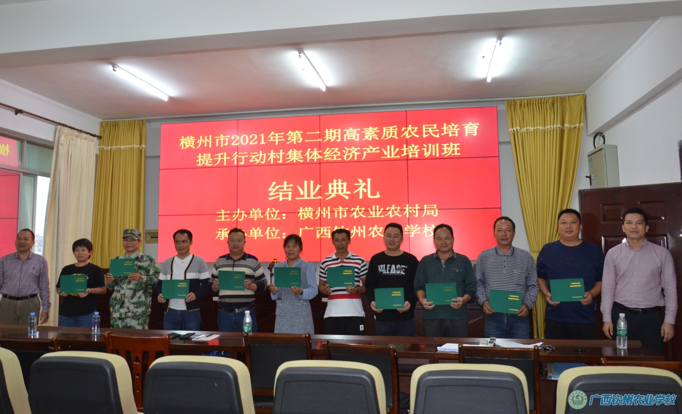 2021年10月11-30日,我校圆满完成了2021年横州市高素质农民培育提升行动村集体经济产业培训班项目任务。根据横州市产业发展需要和乡村建设人才培训需求,此次培训同时开展经营管理型高素质农民二期培训班,分别安排在横州市和学校两地交互进行开展培训工作,每一期15天,对横州市的合作社带头人、农村创新创业青年和产业扶贫带头人等134人从村集体经济产业开展系统的培训。培训班采取“集中培训、重实训”的培训模式,以实地观摩、现场授课方式进行。为确保培训取得实在效果,横州市农业农村局认真组织遴选了培训学员,对培训过程实行全程现场指导,我校严格执行培训计划,每期培训班都建立班主任制度、学员培训考勤制度、满意度调查制度及培训台账制度等。学员一致表示要把培训中所学到的新知识、新技能,真正运用到发展产业当中,努力做好先进生产技术的推动者,助力全市农村经济社会发展再上新台阶。