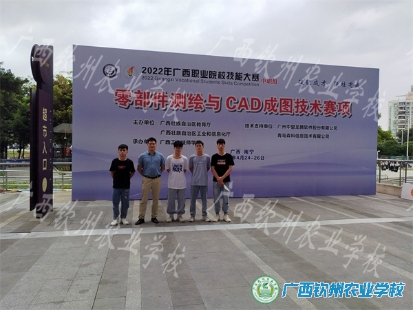 零部件测绘与CAD成图技术赛项选手与指导老师合影(右二为二等奖获得者,汽车电子201班杜显龙同学,右一为三等奖获得者,农机201班梁发盛同学)