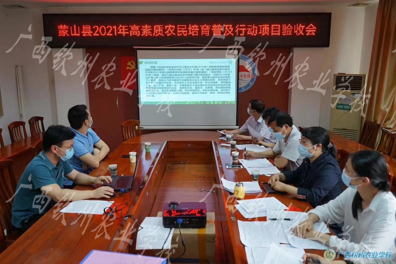 会上,蒙山县农业农村局陈凯燕副局长宣读了《蒙山县2021年高素质农民培育普及行动项目验收办法》,随后验收小组听取了我校李副校长的总结汇报,审查培训材料并进行了现场电话抽查回访。