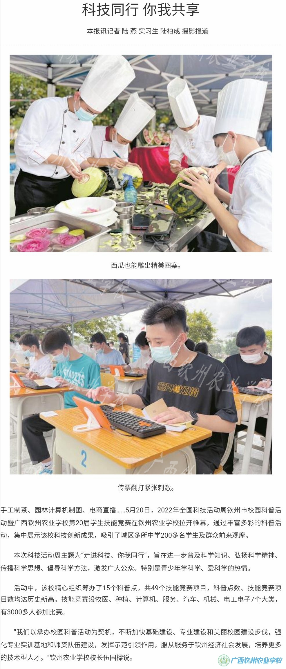 5月20日,2022年全国科技活动周钦州市校园科普活动暨“卓能杯”广西钦州农业学校第20届学生技能竞赛在我校举办。钦州日报对我校活动进行了报道。