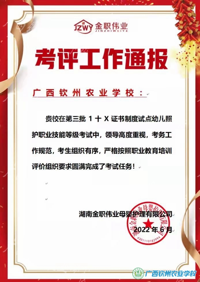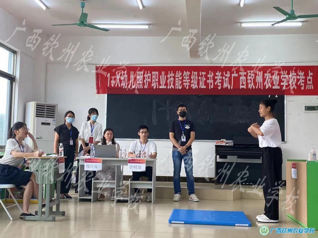 2022年6月18日,“1+X”幼儿照护职业技能等级证书(初级)考试广西钦州农业学校考核站点开考,这是我校作为“1+X”幼儿照护职业技能等级考核站点的首场考试,共有50名学生参加考试,考试通过率100%,获得评价组织考评工作圆满结束通报。