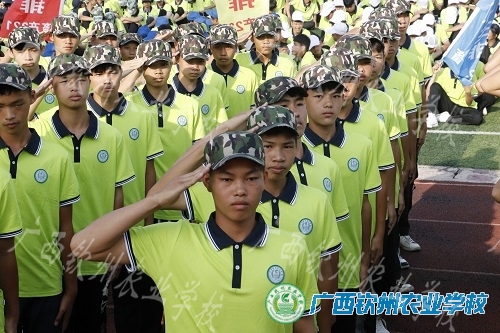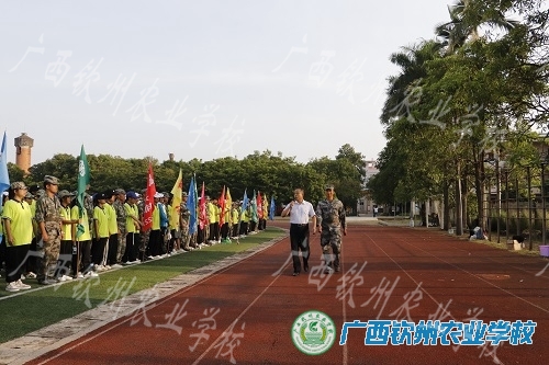 伍国樑校长在钦南区武装部领导李任鉴的陪同下,检阅了全校47个排的7天的军训成果,一句句“为校争光”沁入人心,一句句坚定的口号响彻钦农的操场上空。