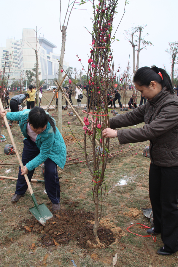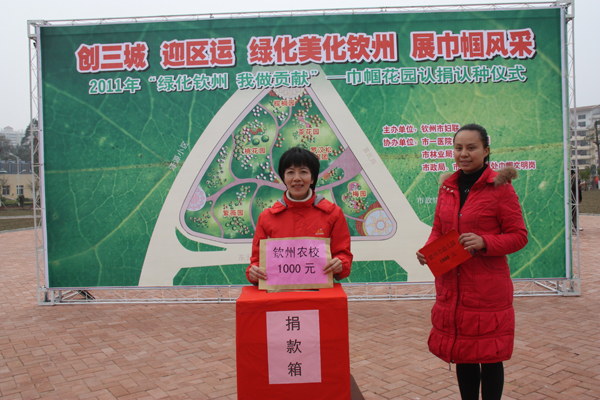2011年3月4日下午,钦州市妇联在市行政中心举行钦州市“巾帼花园”认捐认种植树活动,倡导广大妇女积极投身“创三城 迎区运 绿化美化钦州”主题活动。我校妇委会组织9名师生代表学校参与活动,参与活动的师生代表是:黄小海、黄冰、黄朝华、符菊华、何本连、王白玉、王春霞老师、计算机093班宁秋玲、杨莹莹,学校对“巾帼花园”认捐认种植树活动捐资1000.00元。