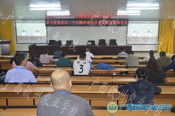 11月15日,学习贯彻党的二十大精神自治区宣讲团在广西农业职业技术大学宣讲。自治区宣讲团成员、自治区党委农办主任、自治区农业农村厅党组书记、自治区乡村振兴局党组书记李宏庆作宣讲报告。本次报告会以视频会议的形式召开,我校在第二实训楼多功能报告厅设分会场,领导班子成员、全体中层干部、党支部书记聆听报告。