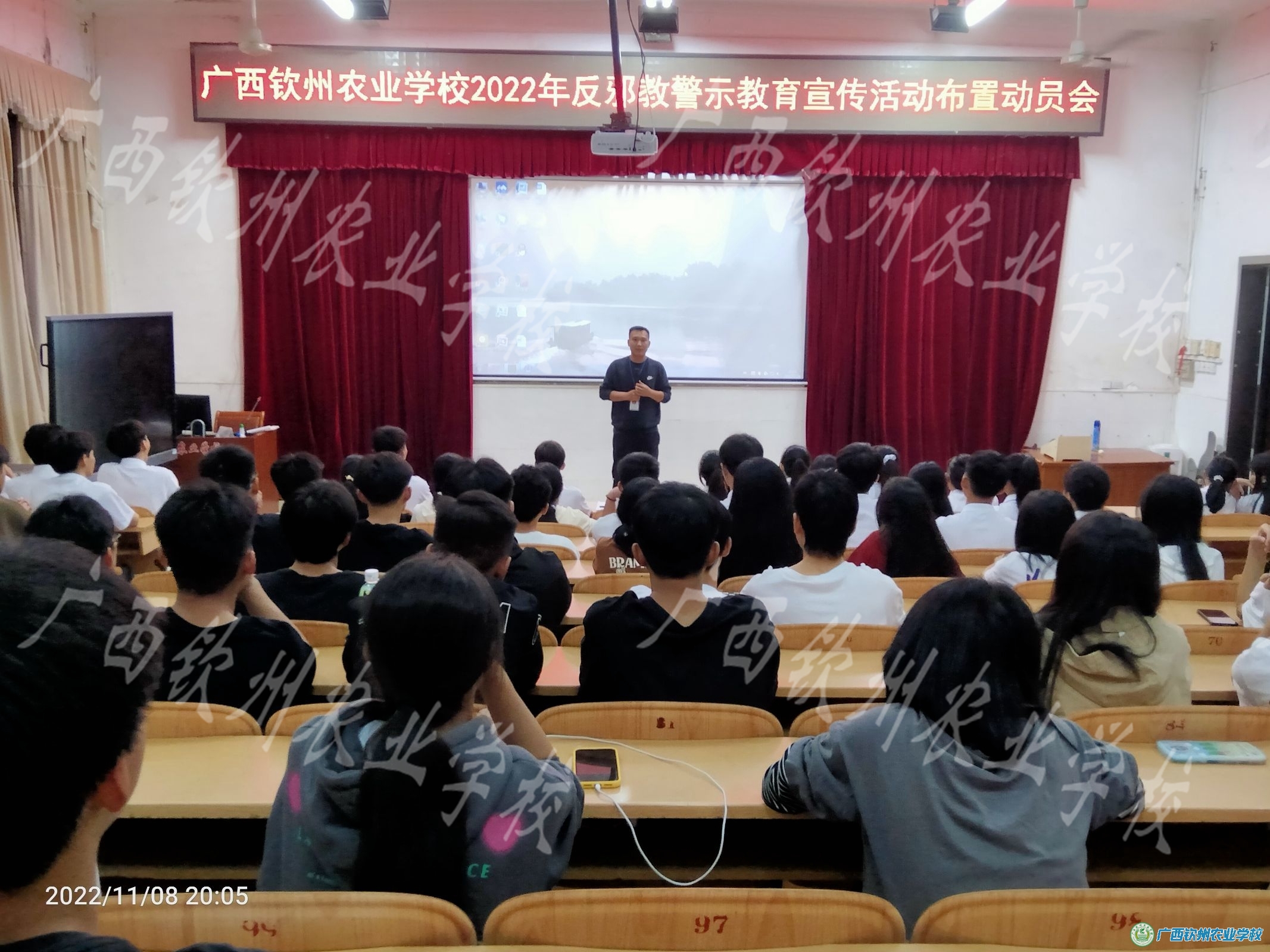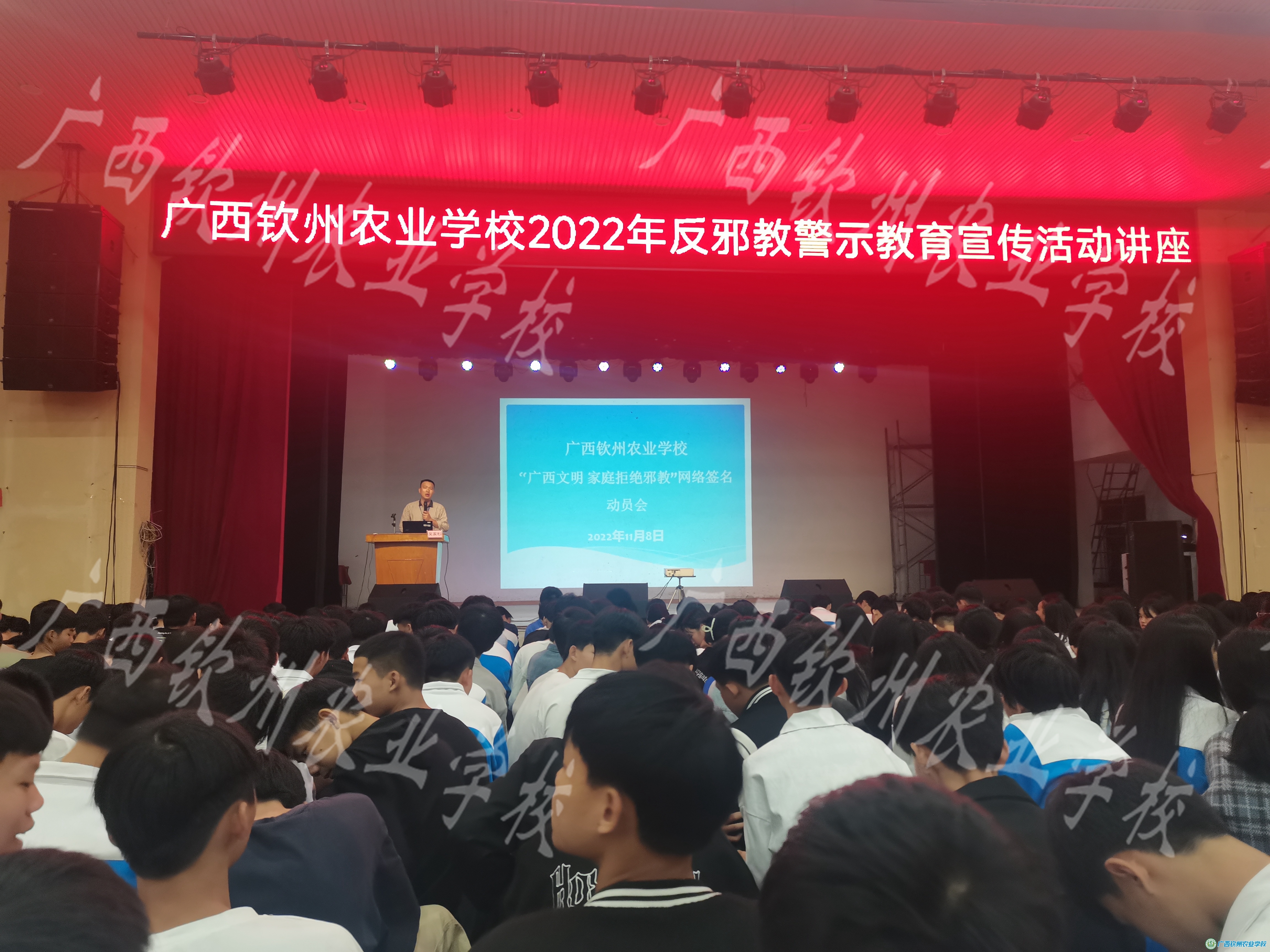 11月8日,保卫科在电化教室召开了护校队以及各班治安委员会议,11月9日,学校在大礼堂举行学生法制教育讲座。在治安委员会议以及法制教育讲座上,保卫科吴明科长从邪教及邪教的种类、邪教是怎样拉拢和控制信徒的、当前邪教发展趋势、加入邪教的危害、加入邪教组织有什么法律后果、如何识别和防范邪教、邪教危害案例等七个方面向同学们宣传如何拒绝邪教,最后利用课件教授同学们如何在“钦州反邪”公众号上对“广西文明家庭拒绝邪教”进行签名。