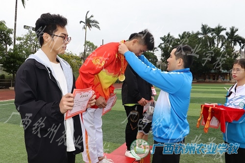 学生科邓业斌为运动员颁发奖牌和奖状