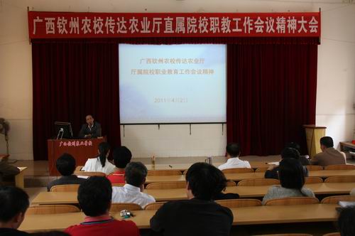 农业厅厅属院校2011年职业教育工作会议于3月24-25日在柳州市召开,会议认真总结自治区职业教育攻坚和2010年职业教育工作情况,提出“十二五”期间各院校工作思路和2011年的工作部署,对各院校“十二五”期间工作具有很强的指导性。为了将会议精神尽快传达和落实,广西钦州农业学校开2011年4月2日下午召开专题会议,传达农业厅厅属院校职业教育工作会议精神。