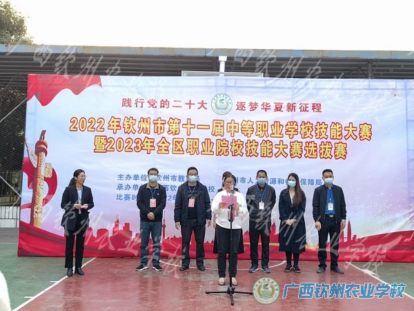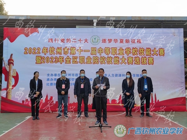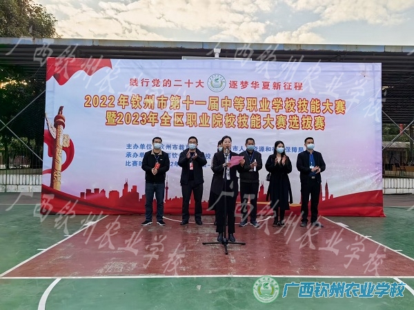 2022年12月16日下午,由钦州市教育局、钦州市人力资源和社会保障局主办、广西钦州农业学校承办的2022年钦州市第十一届中等职业学校技能大赛微生物检验、蔬菜嫁接、农机维修、宠物美容、水产专业技能赛项在我校隆重开幕,开幕式由现代农业学部主任莫莉莉主持,本次出席开幕式的领导有钦州农校赛区总裁判长罗玲、副总裁判长黄嘉明和我校陈明强副校长。开幕式上,我校陈明强副校长致欢迎辞并宣布2022年钦州市第十一届中等职业学校技能大赛钦州农校赛区开幕。