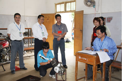 钦州市人力资源和社会保障局培训科领导(右一)和我校领导巡视钳工考试有关领导巡查摩托车维修工的技能操作考核车工考试现场维修电工考试现场