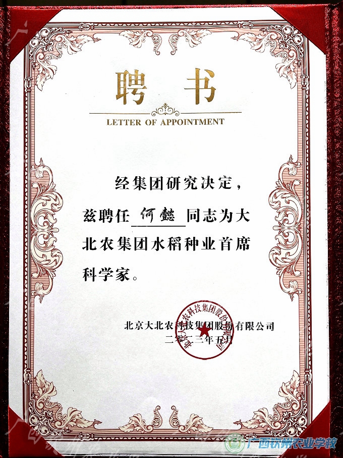 近日,我校优秀校友、广西兆和种业有限公司董事长、广西兆和农作物科学院院长、资深水稻种植专家何懿,被北京大北农科技集团股份有限公司聘为水稻种业首席科学家,这也是继何懿获2022年度广西优秀民营企业家、国家农作物品种审定委员后在农业领域又一项专业认可。