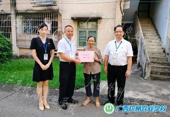 为深入开展学习贯彻习近平新时代中国特色社会主义思想主题教育,切实为社区群众办实事、解难题,6月19日下午,我校开展校社共建办实事“双报到 双服务”认领“微心愿”活动,学校党委书记、校长伍国樑代表学校党委慰问钦州市东南社区困难老党员黄雪如同志,为老人家送去了慰问金,将党组织的关怀送到她的身边。党委委员、党办主任胡礼荣参加活动。