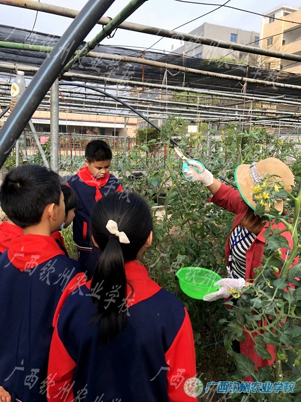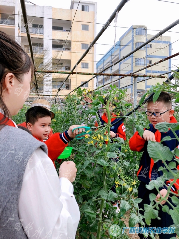 3月11日,钦州市人和小学来我校进行劳动研学。正值小番茄开花需要修剪枝叶之时,梁秀芳老师给同学们安排了修剪枝叶的劳动研学活动。