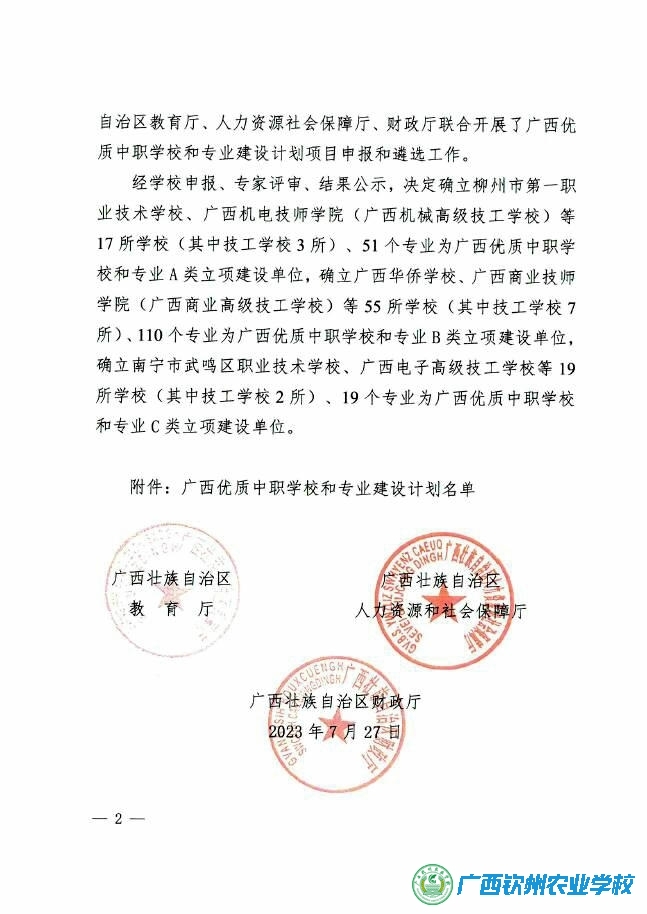 最后,我们衷心感谢广西壮族自治区教育厅、人力资源社会保障厅和财政厅对我校中职教育事业的关心和支持。同时也祝贺其他入选名单中的中职学校,在未来的发展道路上取得更大成就!