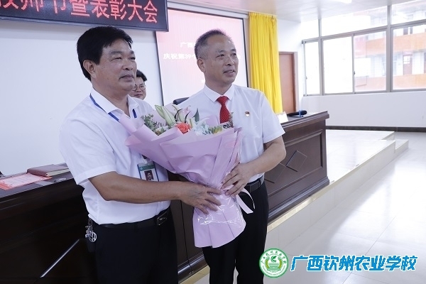 老教师们兢兢业业、默默耕耘,为钦农教育事业奉献自己的青春年华。为向老教师们致以崇高的敬意,伍国樑校长为老教师代表郑修营主任献花留影,并号召全体教师学习传承他们吃苦耐劳、无私奉献的精神,共创美好未来。