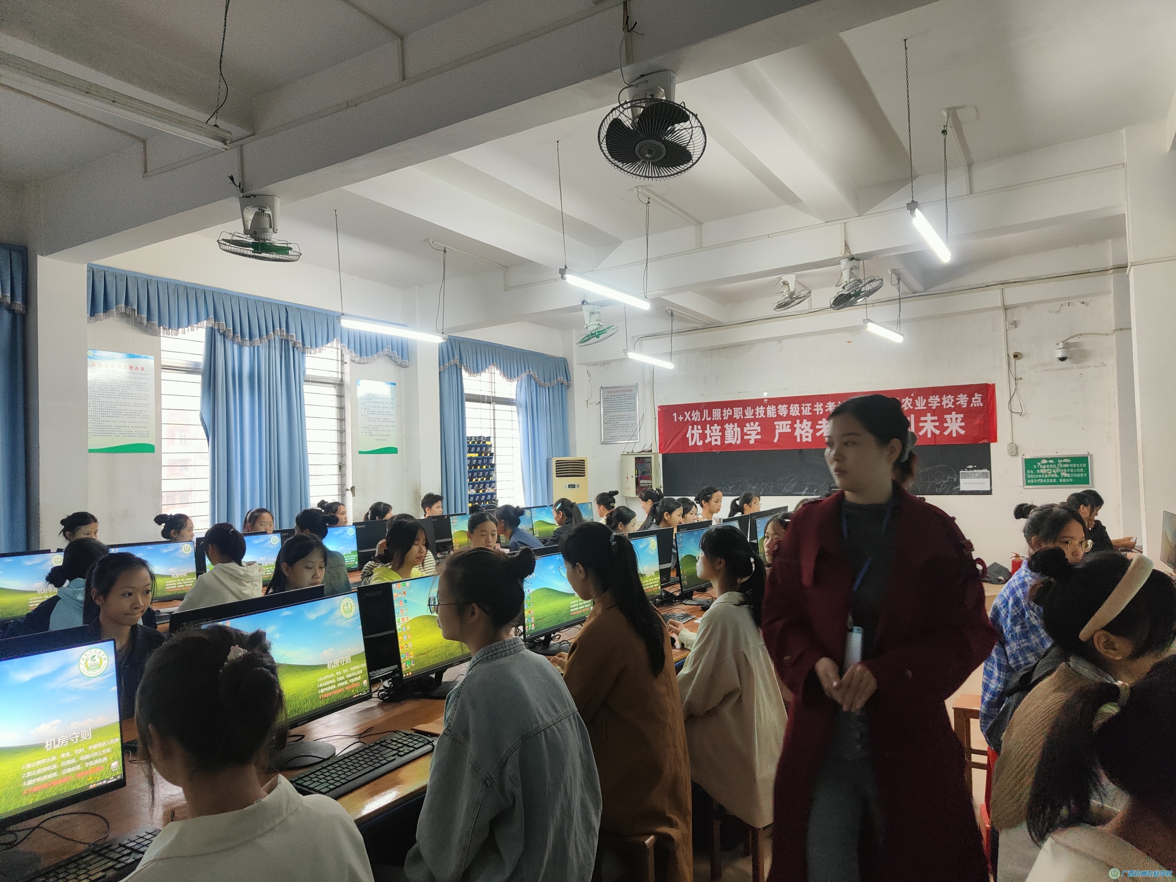本次考试分理论知识和实操技能两个部分进行。考务人员严格遵守考场纪律,考试过程中考风严肃,纪律严明,考务工作人员及学生志愿者们认真负责。
