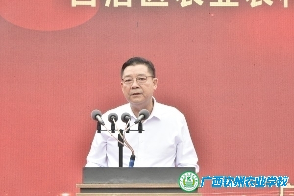 厅党组成员、总农艺师、一级巡视员李如平发表讲话。他首先代表自治区农业农村厅,向学校全体师生员工、离退休教职工和广大校友表示诚挚问候,向一直关心、支持学校建设发展的各级领导、社会各界朋友、广大校友表示衷心感谢,并对我校九十年显著的办学成果表示肯定和赞赏。他强调,自治区农业农村厅始终把农业职业教育、农业农村人才培养放在中心工作全盘规划、重点谋划,将进一步倾斜资源,加大支持力度,为钦州农校等厅属学校营造更好的发展环境,促进学校取得更好更快的发展。为此,他提出四点希望:一是希望我校以建校90周年为契机,全面贯彻党的教育方针,以服务“三农”和乡村振兴为己任,进一步增强责任感使命感,为乡村全面振兴和农业强区建设培养更多高素质技术技能人才;二是希望学校广大教职工不忘立德树人初心,牢记“为党育人、为国育才”使命,积极探索新时代教育教学方法,不断提升教书育人本领,涵养高尚师德,争做“四有”好老师;三是希望同学们立志报国,珍惜时光,学好本领,争取早日成为社会有用之材,以优异的成绩回报母校、报效社会;四是希望参加本次成果交流会的各位来宾、朋友、校友、企业家能一如既往地关心、支持和帮助学校的建设和发展。