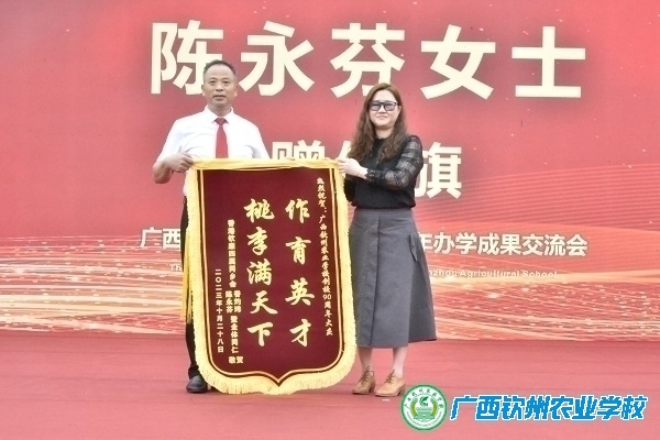 接着,香灼玮先生上台为学校赠送书籍、中国香港钦廉四属同乡会会长陈永芬女士上台为学校赠送锦旗,伍国樑校长分别代表学校领受。