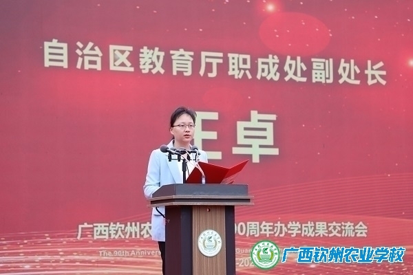 自治区教育厅职成处副处长王卓讲话中对我校拥有深厚办学底蕴和独特办学特色表示肯定。她指出,90年来,我校全面贯彻党的教育方针,落实立德树人根本任务,牢牢把握发展机遇,在办学条件、专业内涵、教学改革、师资队伍、校园文化建设等方面不断提升、成效显著,培养了大批技术技能人才,为经济社会发展作出了积极贡献。她表示,教育厅将一如既往地支持学校的发展。最后,她希望我校认真总结办学经验,深化产教融合校企合作,推进教育教学改革,争取在人才培养质量、学校管理水平、学生成长成才等方面取得更大进步,为全区教育事业发展作出更大贡献,并祝愿我校凝心聚力,团结奋斗,开创美好未来。