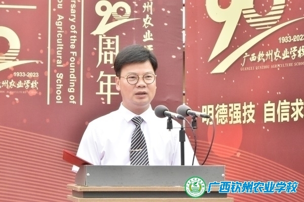 校党委书记、校长伍国樑同志致辞。伍国樑校长代表学校全体师生员工,向出席我校90周年办学成果展的各位领导、嘉宾以及校友们表示最热烈的欢迎和最诚挚的感谢。他指出,进入新时代以来,我校充分发挥现有办学特色及办学优势,不断追求卓越和高质量发展,在国家级重点中等职业学校基础上,发展成为全国科普教育基地、全国国防教育特色学校、全国文明校园、全国乡村振兴人才培养优质校、广西“十四五”四星级中职校、广西优质中职学校和专业立项建设学校、广西中小学劳动教育实践基地、广西中小学研学实践教育基地、第一批自治区中华优秀传统文化艺术传承学校等。学校全力开展面向“三农”的短期培训,助力乡村振兴和地方经济发展;连续12年承办全国科技活动周暨钦州市科普活动,助推全民科学素质全面提升。他表示,今后将继续以习近平新时代中国特色社会主义思想为指导,弘扬和传承学校敢为人先、自强不息、开拓创新、团结拼搏的精神,总结好、传承好学校九十年办学经验,立足现有基础,不骄不躁,抢抓机遇,向着更高目标奋勇前进,续写高质量发展新篇章。